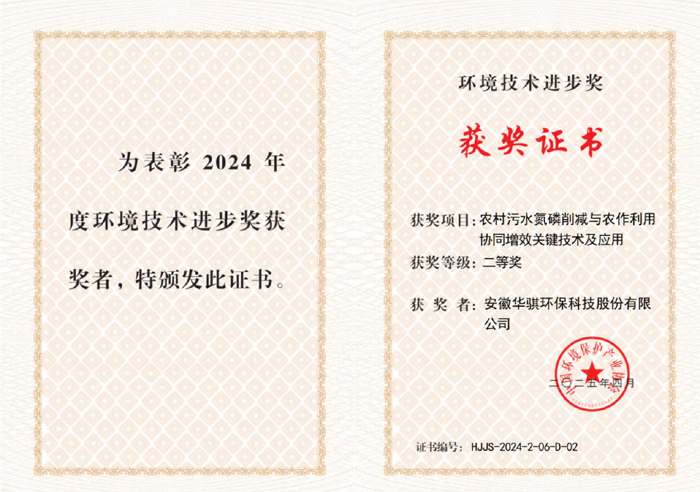2025年4月,由安徽華騏環(huán)保科技股份有限公司與安徽農(nóng)業(yè)大學(xué)聯(lián)合申報的《農(nóng)村污水氮磷削減與農(nóng)作利用協(xié)同增效關(guān)鍵技術(shù)及應(yīng)用》項目,榮獲中國環(huán)境保護產(chǎn)業(yè)協(xié)會頒發(fā)的2024年度“環(huán)境技術(shù)進步獎”二等獎。這項科研成果,成功破解了農(nóng)村污水處理與農(nóng)業(yè)資源化利用的協(xié)同發(fā)展難題,為我國鄉(xiāng)村振興戰(zhàn)略中的生態(tài)治理提供了創(chuàng)新性解決方案。