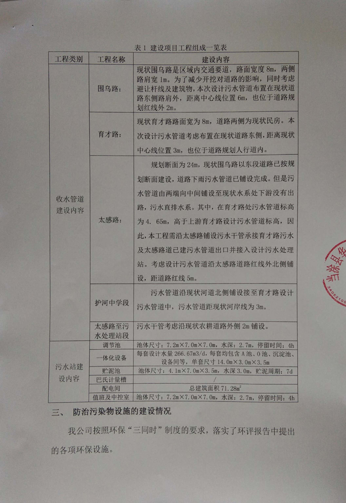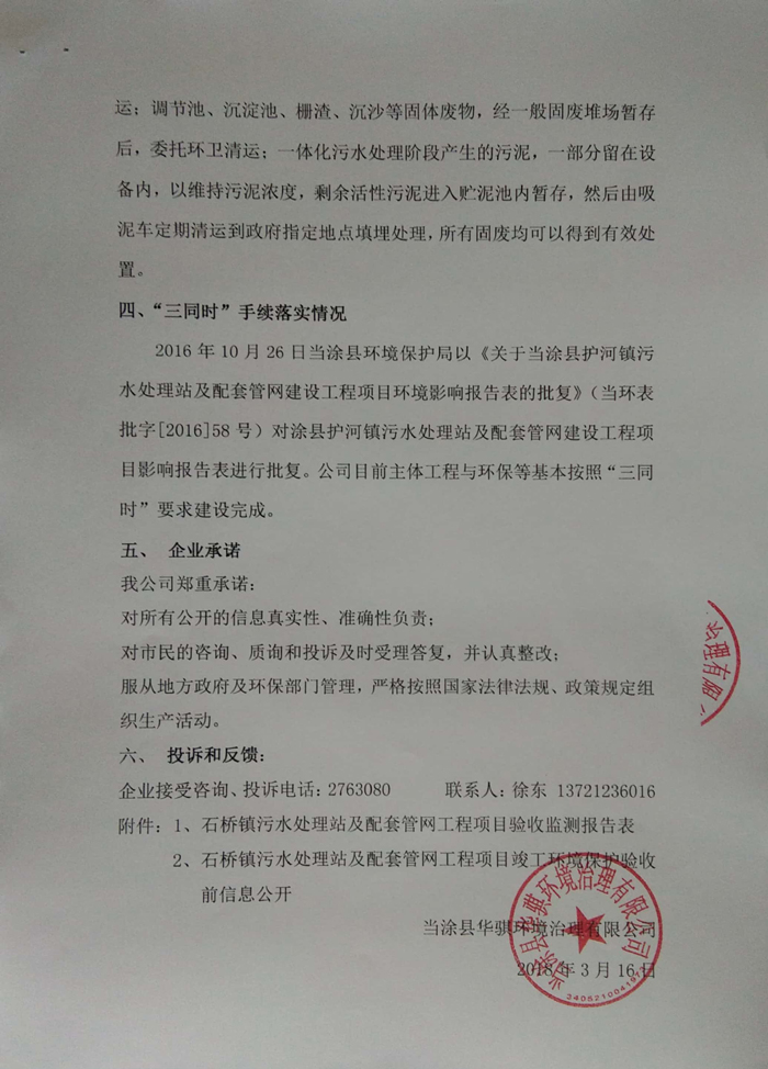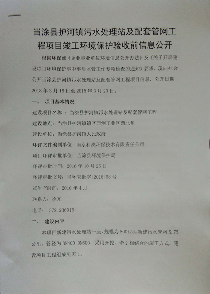 2016年10月26日當(dāng)涂縣環(huán)境保護局以《關(guān)于當(dāng)涂縣護河鎮(zhèn)污水處理站及配套管網(wǎng)建設(shè)工程項目環(huán)境影響報告表的批復(fù)》(當(dāng)環(huán)表批字[2016]58號)對涂縣護河鎮(zhèn)污水處理站及配套管網(wǎng)建設(shè)工程項目影響報告表進行批復(fù)。公司目前主體工程與環(huán)保等基本按照“三同時”要求建設(shè)完成。