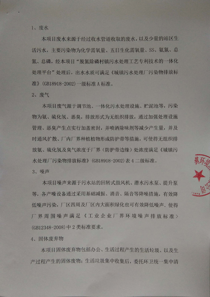 本項目廢水來源于經(jīng)過收水管道收取的廢水,以及少量的站區(qū)生活污水,主要污染物為化學(xué)需氧量、五日生化需氧量、SS、氨氮、總氮、總磷,經(jīng)本項目“脫氮除磷村鎮(zhèn)污水處理工藝專利技術(shù)的一體化處理平臺”處理后,出水水質(zhì)可滿足《城鎮(zhèn)污水處理廠污染物排放標(biāo)準(zhǔn)》(GB18918-2002)一級標(biāo)準(zhǔn)A標(biāo)準(zhǔn)。