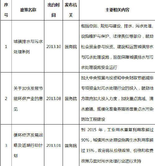 表 1 2013年部分支持污水處理行業(yè)發(fā)展的政策