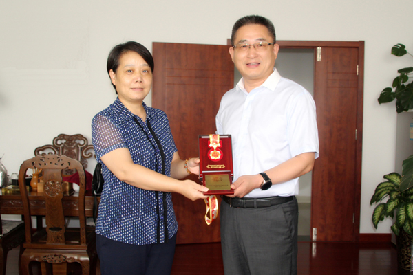 鄭俊從馬鞍山科技局局長(zhǎng)王焰(左)手中接過(guò)紀(jì)念章