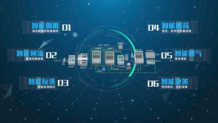 BAF智慧濾池智能調(diào)用、智能回流、智能反洗、智能加藥、智能曝氣、智能決策六駕“馬車”齊發(fā)力,充分發(fā)揮AI 人工智能在水廠運營中的有力作用。智能調(diào)用系統(tǒng)自動計算濾池運行數(shù)量,根據(jù)用戶需求交替啟用,確保冬季低溫下出水水質(zhì)穩(wěn)定達標,同時降低曝氣能耗;智能回流系統(tǒng)實時調(diào)控回流比,解決了硝化液回流過量的問題,確保濾池精準脫氮,大幅節(jié)省電耗;針對不同功能的濾池,智能反洗系統(tǒng)通過選用循環(huán)洗、降水位反沖洗、強制反洗等模式,提高反洗效率,降低反洗頻次,節(jié)省電耗;智能加藥系統(tǒng)結(jié)合進水水質(zhì)水量,AI智能投加反硝化碳源,確??偟_標的前提下大幅度降低藥耗;智能曝氣系統(tǒng)充分考慮氣泡經(jīng)濾料剪切帶來溶解氧升高的影響,實現(xiàn)按需供氧,降低曝氣能耗;智能決策系統(tǒng)根據(jù)運營需求,對不同控制模塊的經(jīng)濟性、安全性、穩(wěn)定性進行綜合比選,制定精準、有效的控制方案。